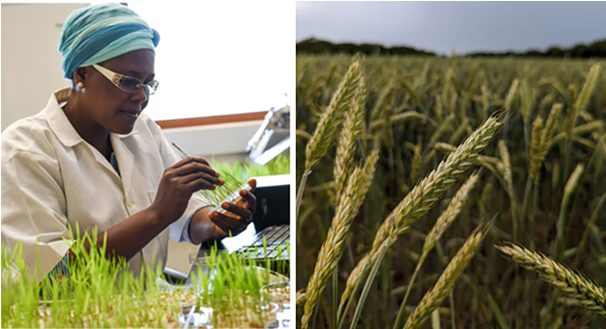 Hình 1. Lúa (trái) và lúa mì (phải) là những cây trồng mục tiêu của các chương trình tăng cường giá trị dinh dưỡng như HarvestPlus, chương trình phát triển và phổ biến các giống cây được tăng cường kẽm nhằm cải thiện chất lượng khẩu phần ăn. Các chiến lược canh tác và di truyền được thực hiện trên đồng ruộng, kết hợp với các thí nghiệm về quản lý dinh dưỡng, góp phần nâng cao giá trị dinh dưỡng của những cây lương thực chủ yếu này. Ảnh bên trái: HarvestPlus. Ảnh bên phải: Sofia Cominelli, nghiên cứu sinh sau đại học, Đại học Bang Kansas.