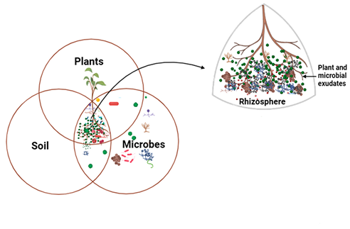 Hiểu rõ mối tương tác giữa đất và vùng rễ là điều cần thiết để duy trì sức khỏe đất, tối ưu hóa quá trình tái chế dinh dưỡng và quản lý đất, đồng thời tăng khả năng hấp thu và tính sẵn có của dinh dưỡng trong cây trồng. Hình minh họa được điều chỉnh từ Hình 2 trong bài “Soil Microbiome: Diversity, Benefits and Interactions with Plants” của Chauhan và cs. (2023) theo giấy phép CC BY 4.0.