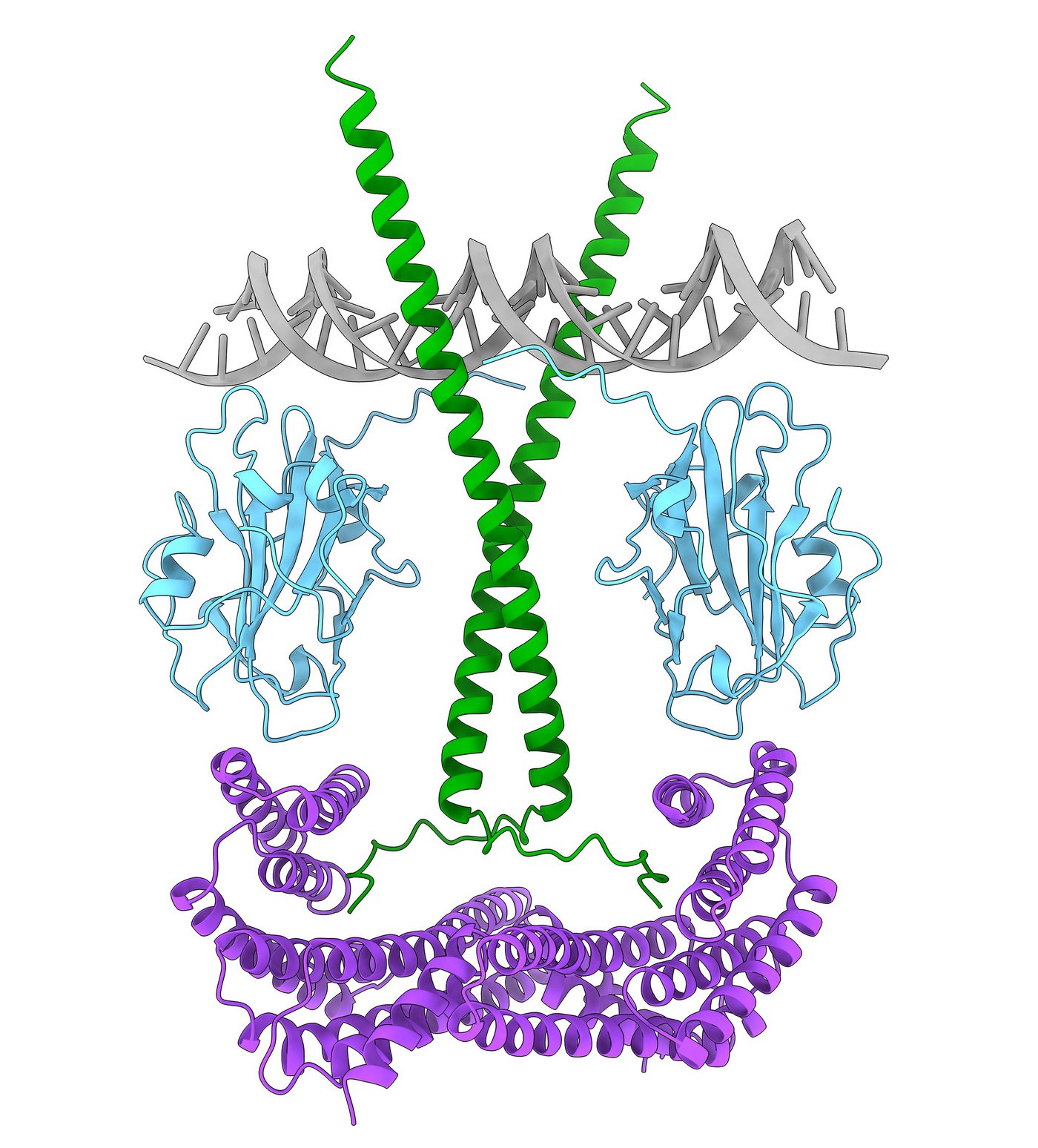 Hình 1. Cấu trúc mô hình của phức hợp FAC–DNA. Protein dimer FD được hiển thị màu xanh lá cây, protein FT màu xanh lam và protein 14-3-3 màu tím. Một chuỗi xoắn DNA màu xám ở phía trên. © Coupland/MPIPZ.