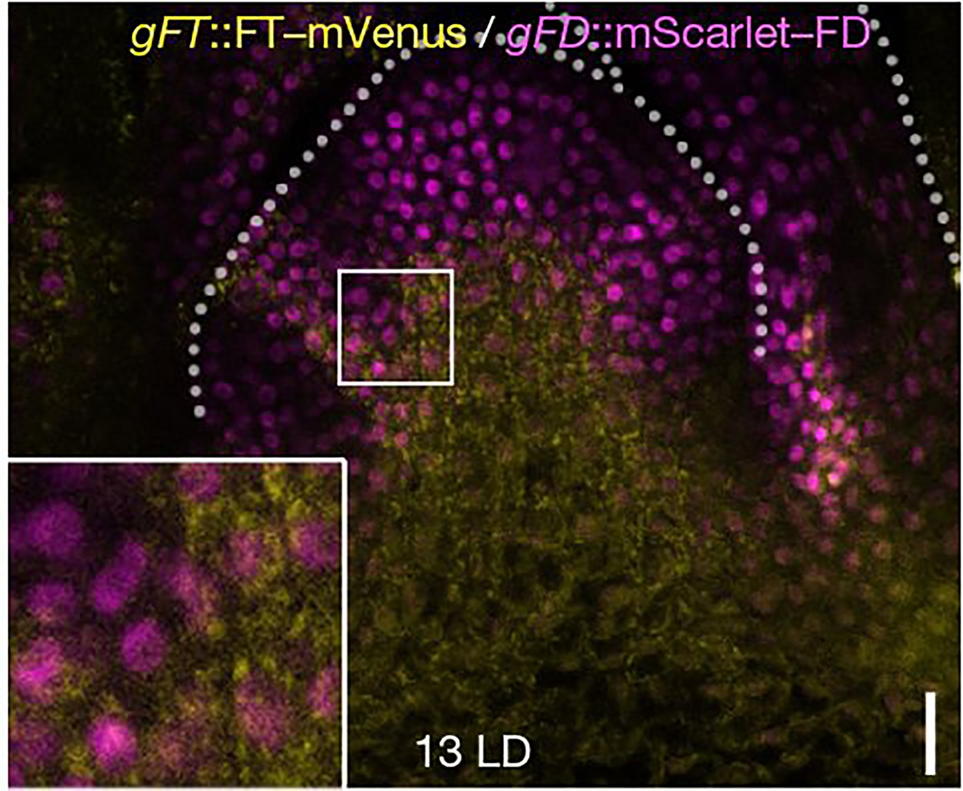 Một định lượng chi tiết về biểu hiện của các protein FD và FT được gắn huỳnh quang ở cấp độ tế bào tại các vùng khác nhau của SAM đã được thực hiện để xác nhận chính xác mức độ chồng chéo của chúng. Ngoài ra, các tác giả đã sử dụng kỹ thuật lai ghép RNA in situ dựa trên huỳnh quang (RNAscope) để hình dung sự tích tụ theo không gian-thời gian của các bản phiên mã FD và FT ở các vùng khác nhau của SAM và giai đoạn hoa nguyên thủy (Hình 2). Nhìn chung, các phân tích protein và mRNA đã xác nhận rằng FT hiện diện trong cùng các tế bào với protein FD và 14-3-3 ở các giai đoạn khác nhau của quá trình cảm ứng hoa tại SAM để cho phép hình thành FAC.