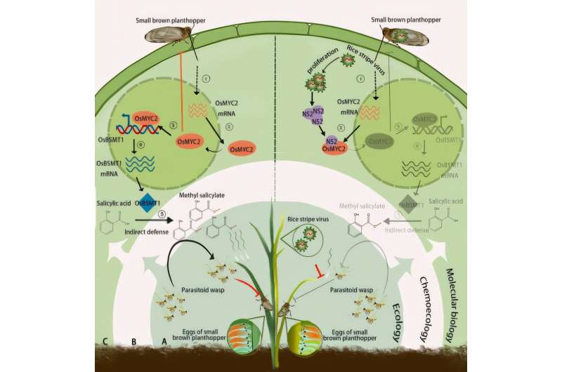 Tuy nhiên, các virus truyền qua côn trùng như virus gây bệnh sọc trong trên lá lúa (Rice Stripe Virus), được lan truyền bởi rầy nâu nhỏ, có thể làm gián đoạn hệ thống phòng vệ này của cây lúa. Thông qua protein NS2, các virus này ức chế quá trình sinh tổng hợp MeSA và về cơ bản “tắt” tín hiệu báo động của cây lúa.