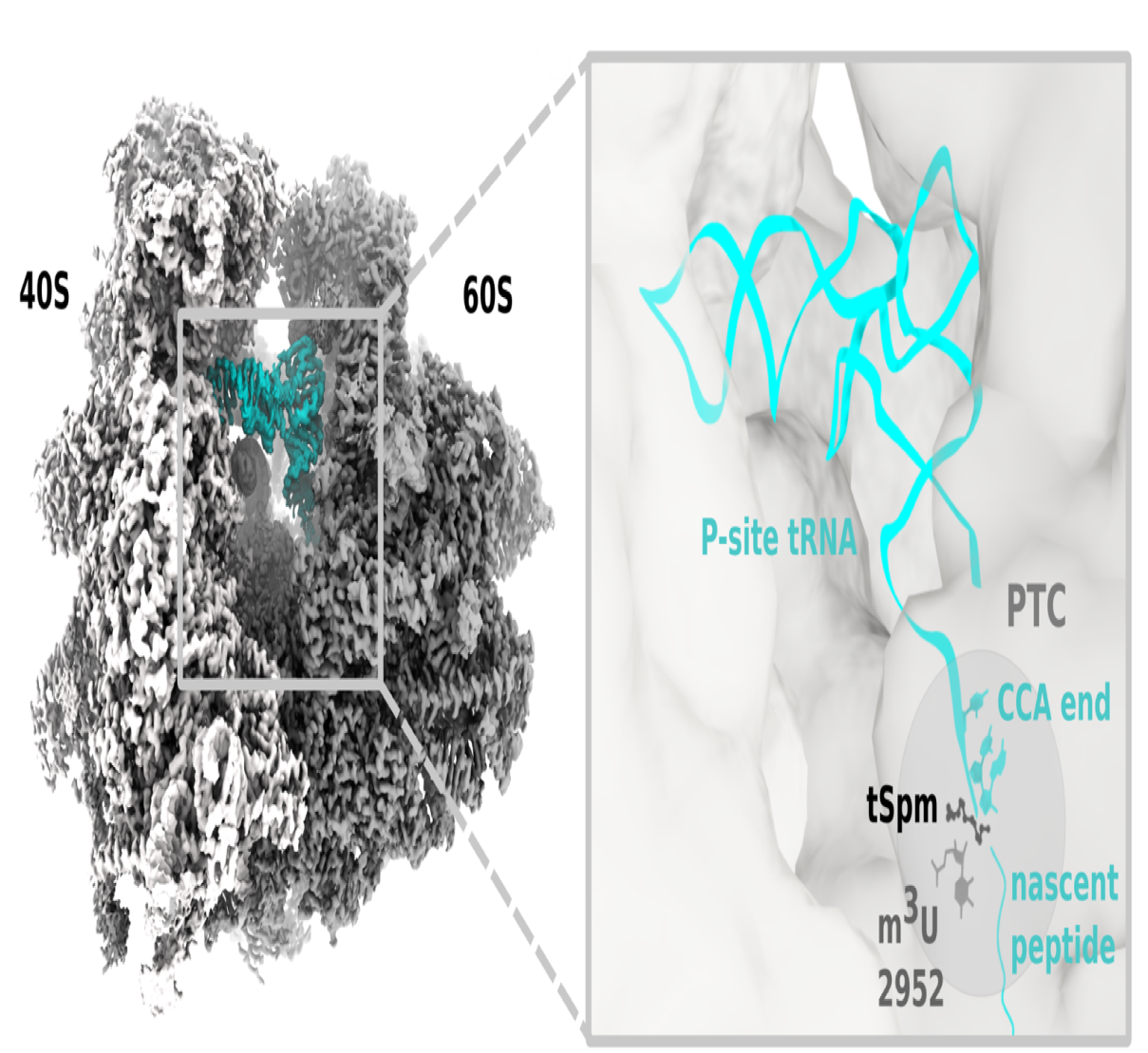 Vị trí của quá trình methyl hóa nằm ở trung tâm chuyển peptidyl (PTC) của ribosome, nơi liên kết peptit có thể được xúc tác. Hình ảnh minh họa sự liên kết của thermospermine (tSpm) với ribosome Arabidopsis bằng cách sử dụng bản đồ cryo-EM của ribosome Arabidopsis WT 80S với tRNA liên kết tại vị trí P (màu lục lam). Sơ đồ PTC, với đầu CCA của tRNA tại vị trí P, tSpm và dư lượng m3U2952 được chỉ ra. Hình ảnh minh họa cấu trúc ribosome do Alexandre Faill thực hiện.
