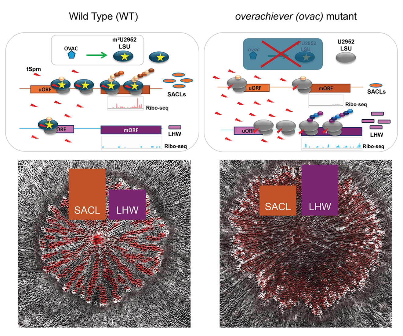 Thermospermine cần sự biến đổi m3U2952 trên ribosome để điều hòa quá trình dịch mã hai chức năng. Ở cây kiểu hoang dại (WT), gen OVAC có thể methyl hóa ribosome (m3U2952). Với sự methyl hóa đặc hiệu này và sự hiện diện của themospermine, SACL có thể được dịch mã nhưng LHW thì không. Cơ chế này bị suy yếu ở đột biến ovac, nơi SACL không được dịch mã, nhưng LHW vẫn có thể được dịch mã. Đồ họa và hình ảnh bởi Donghwi Ko.
