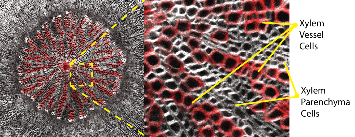 Mặt cắt ngang của trụ mầm cây Arabidopsis thaliana cho thấy cấu trúc mô mạch gỗ được hình thành bởi hai loại tế bào khác nhau – mạch gỗ (màu đỏ) và tế bào nhu mô mạch gỗ. Nhuộm mạch gỗ bằng SR2200 và Fuchsin. Ảnh chụp bởi Donghwi Ko.