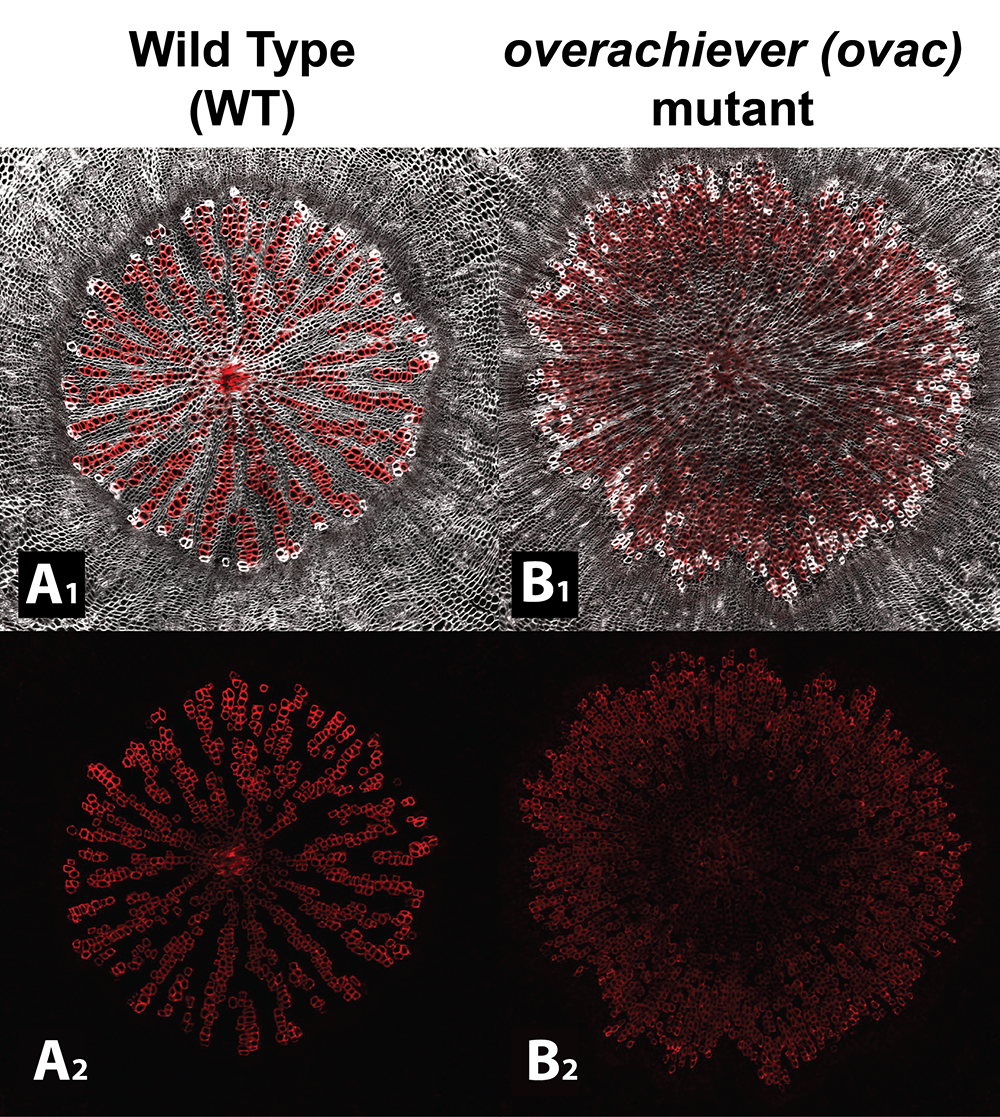 Mặt cắt ngang của trụ mầm cây Arabidopsis thaliana 8 tuần tuổi. Đột biến ovac thể hiện sự biệt hóa mạch thứ cấp mạnh hơn (màu đỏ) đồng thời làm giảm số lượng tế bào nhu mô. Hình A2 và B2 chỉ hiển thị các tế bào mạch. Nhuộm SR2200 và Fuchsin. Ảnh chụp bởi Donghwi Ko.