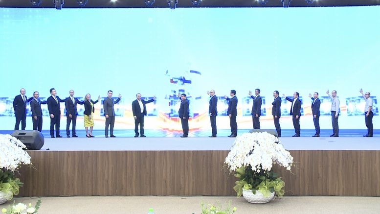 Phó Thủ tướng Nguyễn Chí Dũng và các đại biểu thực hiện nghi lễ công bố các sáng kiến nhằm triển khai Nghị quyết 57 của các mạng lưới ĐMST và chuyên gia các ngành công nghệ chiến lược.