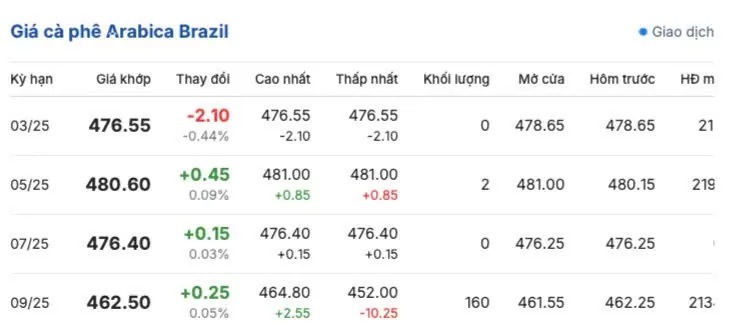 Kết thúc phiên giao dịch giá cà phê Arabica Brazil tiếp tục có sự tăng - giảm đan xem giữa các kỳ hạn giao hàng, dao động 452.00 - 476.55 USD/tấn. Được ghi nhận như sau: kỳ giao hàng tháng 3/2025 là 476.55 USD/tấn; kỳ giao hàng tháng 5/2025 là 480.60 USD/tấn; kỳ giao hàng tháng 7/2025 là 476.40 và kỳ giao hàng tháng 9/2025 là 462.50 USD/tấn.