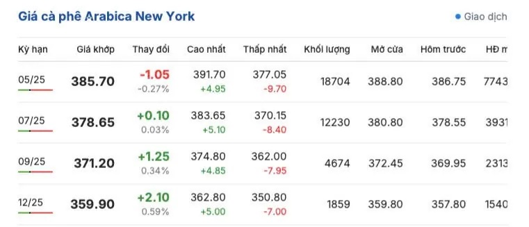 Tương tự, giá cà phê Arabica trên sàn New York sáng sớm ngày 14/3 có sự giằng co tăng - giảm qua các kỳ hạn giao hàng so với phiên giao dịch trước đó, dao động 350.80 - 391.70 cent/lb. Cụ thể, kỳ giao hàng tháng 5/2025 là 385.70 cent/lb; kỳ giao hàng tháng 7/2025 là 378.65 cent/lb; kỳ giao hàng tháng 9/2025 là 371.20 cent/lb và kỳ giao hàng tháng 12/2025 là 359.90 cent/lb.