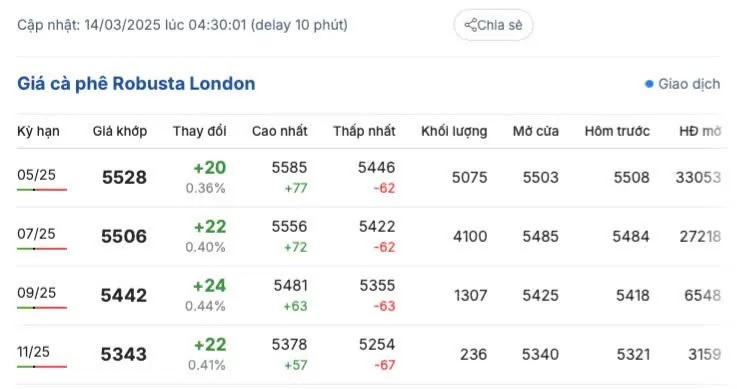 Trên sàn London, vào lúc 4 giờ 30 phút ngày 14/3/2025, kết thúc phiên giao dịch giá cà phê Robusta tăng nhẹ trở lại so với phiên giao dịch hôm qua, mức tăng từ 20 - 24 USD/tấn, dao động 5.254 - 5.585. Cụ thể, giá giao hàng tháng 5/2025 là 5.528 USD/tấn; giá giao hàng tháng 7/2025 là 5.506 USD/tấn; giá giao hàng tháng 9/2025 là 5.542 USD/tấn và giá giao tháng 11/2025 là 5.343 USD/tấn.