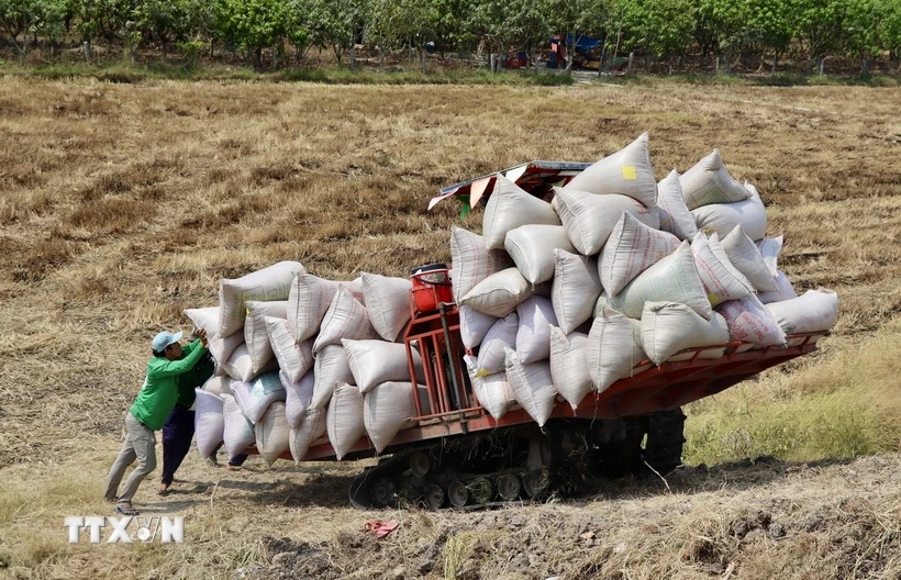 Nông dân thành phố Châu Đốc thu hoạch lúa Đông Xuân cuối vụ. (Ảnh: Thanh Sang/TTXVN).