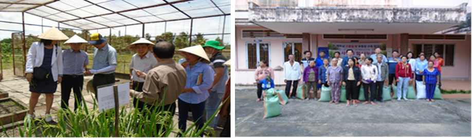 Đoàn đánh giá các giống lúa Hàn Quốc (VL) ở trong nhà lưới Tiến sĩ Kyung Hee Han và bà quản đốc tập đoàn NARA chụp hình lưuniệm cùng nông dân