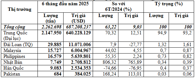 Riêng tháng 6/2025 ước đạt 273.018 tấn, tương đương 85,43 triệu USD, giá trung bình 312,9 USD/tấn, giảm 29,5% về lượng, giảm 26,5% kim ngạch nhưng tăng 4,3% về giá so với tháng 5/2025; còn so với tháng 6/2024 thì tăng mạnh 93,3% về lượng, tăng 25,2% kim ngạch nhưng giảm 35,2% về giá.