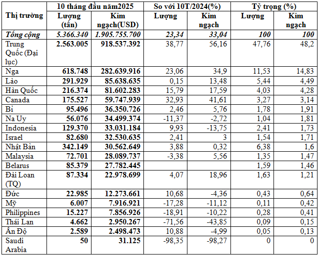 Phân bón nhập khẩu về Việt Nam nhiều nhất từ thị trường Trung Quốc, chiếm trên 47,8% cả về lượng và chiếm 48,2% về kim ngạch trong tổng nhập khẩu phân bón của cả nước, đạt 2,56 triệu tấn, trị giá 918,54 triệu USD, giá trung bình 358,4 USD/tấn; tăng 38,8% về lượng, tăng 56,2% về kim ngạch và tăng 12,5% về giá so với 10 tháng năm 2024.
