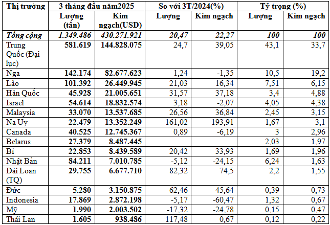 Tính chung 3 tháng đầu năm 2025, nhập khẩu phân bón đạt 1,35 triệu tấn, trị giá trên 430,27 triệu USD, giá trung bình 318,8 USD/tấn, tăng 20,5% về lượng, tăng 22,3% về kim ngạch và tăng 1,5% về giá so với 3 tháng đầu năm 2024.