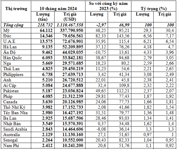 Thị trường Mỹ tiêu thụ nhiều nhất các loại hạt tiêu của Việt Nam, đạt 64.112 tấn, tương đương 337,79 triệu USD, chiếm 29,3% trong tổng lượng và chiếm 30,4% trong tổng kim ngạch xuất khẩu hạt tiêu của cả nước, tăng 48,3% về lượng, tăng 95,2% kim ngạch so với cùng kỳ 10 tháng đầu năm 2023, giá tăng 31,7%, đạt 5.269 USD/tấn.