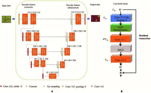 (A và B) Kiến trúc U-Net với các khối ConvNeXt. Nguồn: Plant Phenomics (2024). DOI: 10.34133/plantphenomics.0182