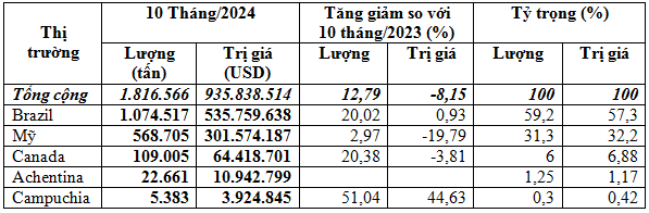 Tiếp đến thị trường Canada trong 10 tháng đầu năm 2024 đạt 109.005 tấn, tương đương 64,42 triệu USD, giá 591 USD/tấn, chiếm 6% trong tổng lượng và chiếm 6,9% trong tổng kim ngạch nhập khẩu đậu tương của cả nước, tăng 20,4% về lượng, nhưng giảm 3,8% về kim ngạch và giá giảm 20,1% so với cùng kỳ năm trước.