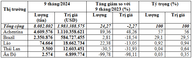 Achentina là thị trường lớn nhất cung cấp ngô cho Việt Nam trong 9 tháng đầu năm 2024, chiếm 57% trong tổng lượng và chiếm 56% trong tổng kim ngạch nhập khẩu ngô của cả nước, đạt gần 4,61 triệu tấn, tương đương trên 1,11 tỷ USD, giá 240,9 USD/tấn, tăng 89,4% về lượng, tăng 48,3% kim ngạch nhưng giảm 21,7% về giá so với 9 tháng đầu năm 2023.