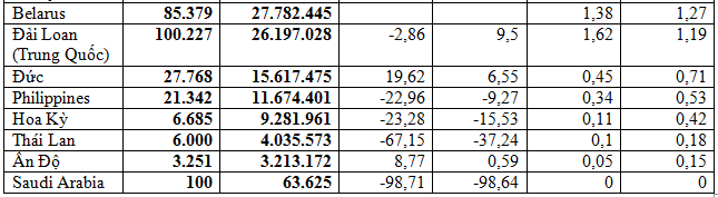 Tiếp sau đó là thị trường Nga chiếm 11% trong tổng lượng và chiếm 14,4% trong tổng kim ngạch, đạt 679.652 tấn, tương đương 315,19 triệu USD, giá trung bình 463,8 USD/tấn, tăng 24% về lượng, tăng 37,9% kim ngạch nhưng giảm 11,1% về giá so với năm 2024.