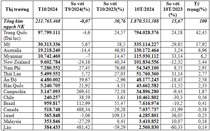 Các thị trường lớn cung cấp rau quả cho Việt Nam trong 10 tháng năm nay là Trung Quốc, Mỹ, Australia và Myanmar; trong đó nhập khẩu nhập khẩu nhiều nhất từ thị trường Trung Quốc, đạt 794,03 triệu USD, tăng 21,2% so với cùng kỳ năm 2023, chiếm 42,5% trong tổng kim ngạch nhập khẩu nhóm hàng này của cả nước; riêng tháng 10/2024 nhập khẩu từ thị trường này đạt 97,8 triệu USD, giảm 4,6% so với tháng 9/2024 nhưng tăng 24,6% so với tháng 10/2023