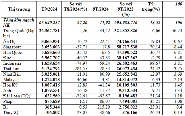 Thuốc trừ sâu và nguyên liệu nhập khẩu chủ yếu từ thị trường Trung Quốc, chiếm 46,2% trong tổng kim ngạch nhập khẩu nhóm hàng này của cả nước, với gần 321,86 triệu USD, tăng 6,7% so với cùng kỳ năm trước. Riêng trong tháng 9/2024 kim ngạch giảm 5,3% so với tháng 8/2024 và giảm 34,4% so với tháng 9/2023, đạt gần 26,37 triệu USD.