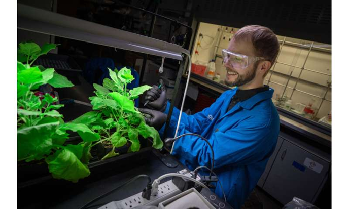 Nhà nghiên cứu của Đại học UC San Diego phun một lớp phủ polymer kháng khuẩn lên lá cây Nicotiana benthamiana. Nguồn: David Baillot/Trường Kỹ thuật Jacobs, Đại học UC San Diego.