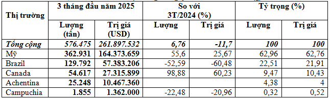 Nhập khẩu đậu tương từ thị trường Canada 3 tháng đầu năm 2025 đạt 54.617 tấn, tương đương 27,32 triệu USD, giá 500,1 USD/tấn, chiếm 9,5% trong tổng lượng và chiếm 10,4% tổng kim ngạch nhập khẩu đậu tương của cả nước, tăng mạnh 98,9% về lượng, tăng 60,2% về kim ngạch nhưng giá giảm 19,4% so với 3 tháng đầu năm 2024.