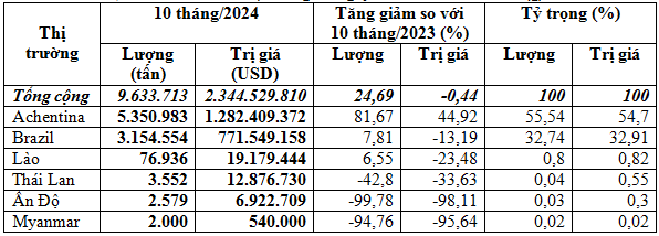 Achentina là thị trường lớn nhất cung cấp ngô cho Việt Nam trong 10 tháng đầu năm 2024, chiếm 55,5% trong tổng lượng và chiếm 54,7% trong tổng kim ngạch nhập khẩu ngô của cả nước, đạt trên 5,35 triệu tấn, tương đương trên 1,28 tỷ USD, giá 239,7 USD/tấn, tăng 81,7% về lượng, tăng 44,9% kim ngạch nhưng giảm 20,2% về giá so với 10 tháng đầu năm 2023.