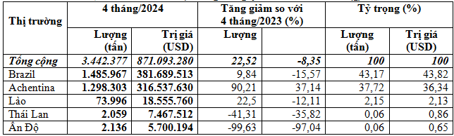 Trong đó, riêng tháng 4/2024 đạt 661.615 tấn, tương đương 167,93 triệu USD, giá trung bình 253,8 USD/tấn, giảm 24% về lượng và giảm 22,2% kim ngạch so với tháng 3/2024, nhưng giá tăng 2,5%; so với tháng 4/2023 thì tăng 6,4% về lượng, nhưng giảm 20,8% về kim ngạch và giảm 25,5% về giá.