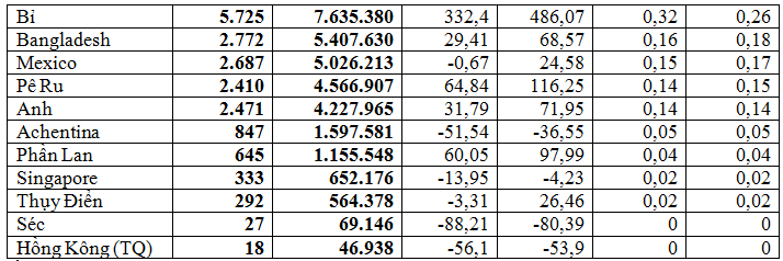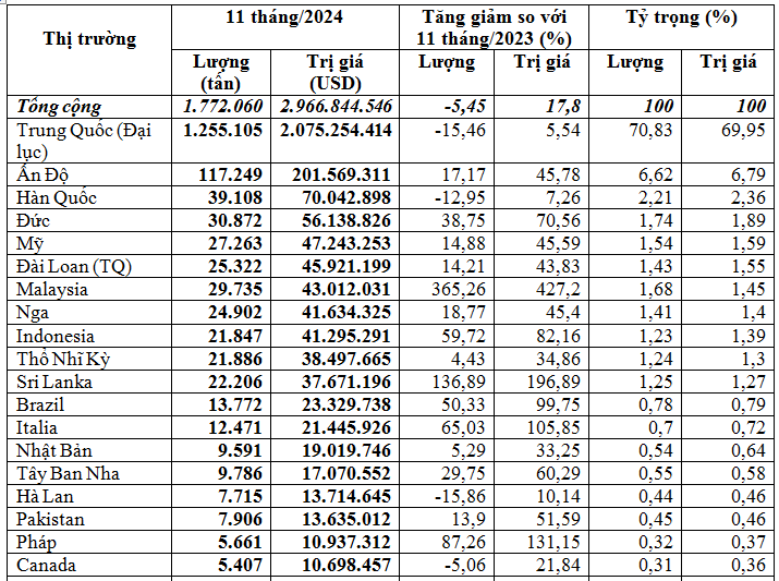 Đứng sau thị trường chủ đạo Trung Quốc là các thị trường như: Ấn Độ đạt 117.249 tấn, trị giá 201,57 triệu USD, giá trung bình 1.719 USD/tấn; tăng 17,2% về lượng, tăng 45,8% về trị giá và tăng 24,4% về giá; Hàn Quốc đạt 39.108 tấn, trị giá 70,04 triệu USD, giá trung bình 1.791 USD/tấn; giảm 13% về lượng, nhưng tăng 7,3% về trị giá và tăng 23,2% về giá.