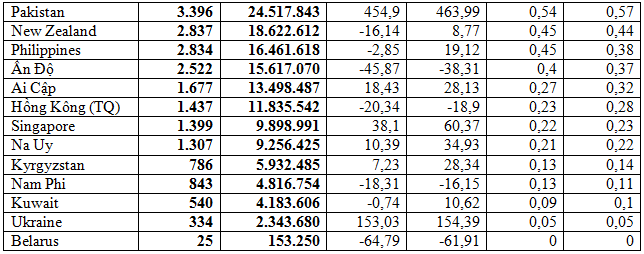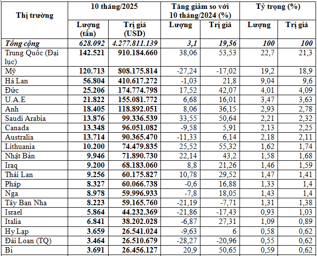 Riêng tháng 10/2025 ước đạt 73.231 tấn, tương đương 504,22 triệu USD, giá trung bình 6.885 USD/tấn, tăng 1,1% về lượng, tăng 2,6% kim ngạch và tăng 1,5% về giá so với tháng 9/2025; So với tháng 10/2024 thì cũng tăng 12,3% về lượng, tăng 18,8% kim ngạch và tăng 5,8% về giá.