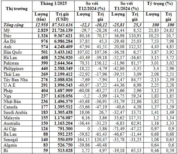 Thị trường Mỹ tiêu thụ nhiều nhất các loại hạt tiêu của Việt Nam, đạt 2.829 tấn, tương đương 21,73 triệu USD, giá trung bình 7.680 USD/tấn, chiếm 21,8% trong tổng lượng và chiếm 24,8% trong tổng kim ngạch xuất khẩu hạt tiêu của cả nước, giảm 29,7% về lượng giảm 28,3% về kim ngạch nhưng tăng 2% về giá so với tháng 12/2024; so với tháng 1/2024 giảm mạnh 41,4% về lượng nhưng tăng 8,5% về kim ngạch và tăng mạnh 85,3% về giá.