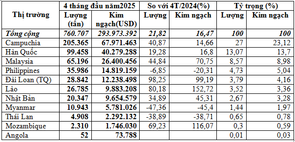 Đáng chú ý, các thị trường xuất khẩu tăng mạnh so với cùng kỳ gồm có: Lào tăng 80,2% về lượng, tăng 152,7% về kim ngạch, đạt 26.785 tấn, trị giá 9,88 triệu USD; Đài Loan tăng mạnh trên 98,3% về lượng và tăng 99,2% kim ngạch, đạt 28.842 tấn, trị giá 12,24 triệu USD; Mozambique tăng 69,2% về lượng và tăng 116% kim ngạch, đạt 2.310 tấn, trị giá 1,75 triệu USD.