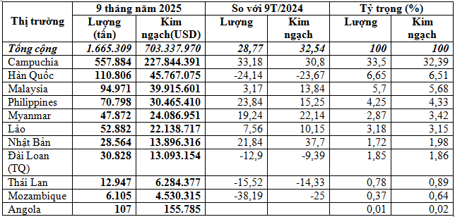 Phân bón của Việt Nam xuất khẩu nhiều nhất sang thị trường Campuchia, chiếm 33,5% về lượng và chiếm 32,4% về kim ngạch trong tổng xuất khẩu phân bón của cả nước, đạt 557.884 tấn, trị giá 227,84 triệu USD, giá trung bình 408,4 USD/tấn; tăng 33,2% về lượng, tăng 30,8% về trị giá nhưng giảm 1,8% về giá so với 9 tháng năm 2024.