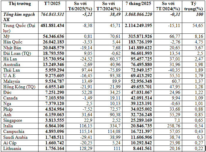 Đứng sau thị trường chủ đạo Trung Quốc là thị trường Mỹ đạt trên 315,87 triệu USD, tăng mạnh 66,8% so với 7 tháng đầu năm 2024, chiếm 8,2%; Hàn Quốc đạt 183,73 triệu USD, giảm nhẹ 2,8%, chiếm 4,8%; Nhật Bản đạt 141,89 triệu USD, tăng 20,7%, chiếm 3,7%; Đài Loan đạt 96,6 triệu USD, tăng 13,5%, chiếm 2,5%...