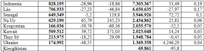 Riêng tháng 7/2025 xuất khẩu đạt 764,84 triệu USD, giảm 5,2% so với tháng 6/2025 nhưng tăng mạnh 38,5% so với tháng 7/2024.