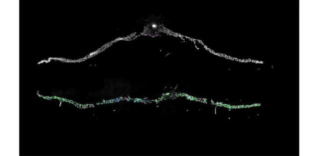 Hình cắt ngang của lá Arabidopsis trong điều kiện hạn hán (trên) và sau 15 phút được tái cấp nước (dưới). Mỗi màu (xanh lam, hồng, xanh lá) biểu thị sự biểu hiện của một gen cảm ứng phục hồi khác nhau (Nguồn: Viện Salk)