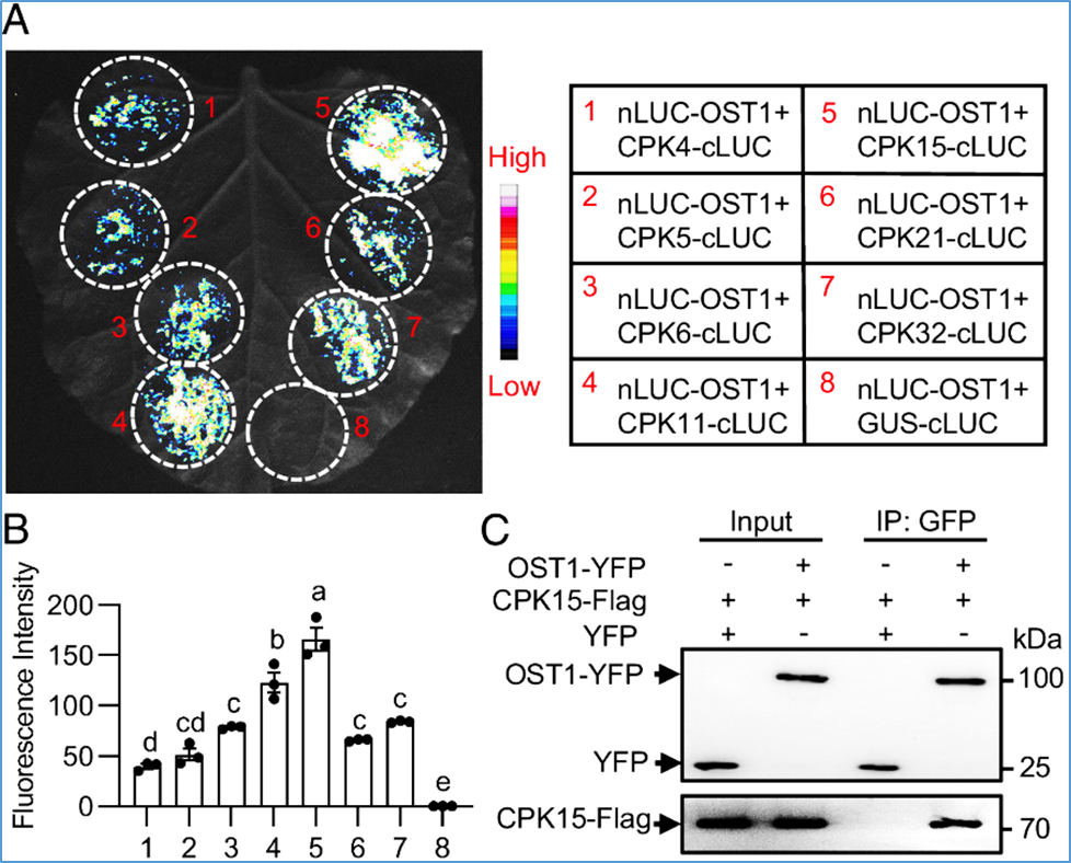 (A) Tương tác của OST1 với CPKs qua kết quả xét nghiệm “split-LUC”. (B) Kết quả phân tích số lượng cường lực của luminescence.