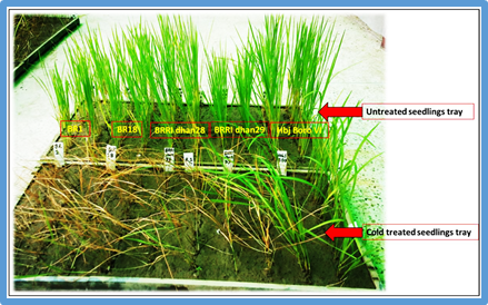 Tổn thương do lạnh đối với cây lúa giai đoạn mạ là thách thức to lớn cũa tăng trưởng và năng suất thóc. Cho dù người ta đã xác định được QTLs trên bản đồ di truyền và ghi nhận được các gen đích của tính trạng chịu lạnh, những mọi cố gắng trong cải tiến giống lúa vẫn còn đối mặt với sự thiếu nhiều các chỉ thị phân tử chính xác. Trong nghiên cứu này người ta tiến hành phân tích 529 mẫu giống lúa từ tập đoàn 3K Rice Genomic Diversity để nghiên cứu các biến thể di truyền của gen OsCTS11, một regulator âm tính với tính chống chịu lạnh vào giai đoạn mạ. Phân tích giá trị LD (linkage disequilibrium) xác định được ba “LD blocks” cực trọng (BLOCK1-3) trong phân tử gen OsCTS11. Mỗi block có 4 haplotypes khác biệt nhau. Phân tích di truyền kiểu “association” cho thấy Hap4 trong BLOCK1, Hap3 trong BLOCK2, và Hap4 trong BLOCK3 làm tăng đáng kể tỷ lệ sống sót cây mạ bị xử lý lạnh; với kết quà 65,38%, 58,41%, và 51,48%, theo thứ tự, ưu thế thuộc về loại hình cây lúa japonica. Những haplotypes có ưu thế thuận lợi này minh chứng được tính thích nghi của cây lúa với vùng canh tác lúa ôn đới (30°–40°N) và cao nguyên trồng lúa nhiệt đới (cao trình 800–1500 m), phù hợp với quá trình tiến hóa của tính chống chịu lạnh của cây lúa japonica. Việc sử dụng KASP molecular markers trên cơ sở các vị trí của SNP được minh chứng thông qua kết quả này. Trong số 42 giống lúa được sàng lọc, giống indica R676 và giống japonica Nangeng 5718, cả hai đều có những haplotypes trội (dominant), biểu hiện tỷ lệ cây sống cao hơn so với giống lúa thiếu các haplotypes như vậy. “Marker-assisted backcrossing” (hồi giao nhờ chỉ thị phân tử) giúp cho việc phát triển ra 4 nguồn vật liệu chịu lạnh mới (YR05-YR08) được tích hợp trong những haplotypes OsCTS11 có lợi. Chú ý, YR08 (Hap4 + Hap3 + Hap4) biểu thị sự cải tiến đáng kể sự phát triển cây mạ bị stress lạnh, minh họa lợi ích cộng dồn của những haplotypes chồng lấp lên nhau. Kết quả ghi nhận tiềm năng của việc tận dụng haplotypes có biến thể tự nhiên để sáng tạo nên những markers chính xác phục vụ xác định haplotypes của gen OsCTS11. Kết quả cung cấp một phương pháp tiếp cận mới nhằm khai thác hiệu quả gen điều tiết có tính chất tiêu cực trong chương trình lai tạo giống lúa.