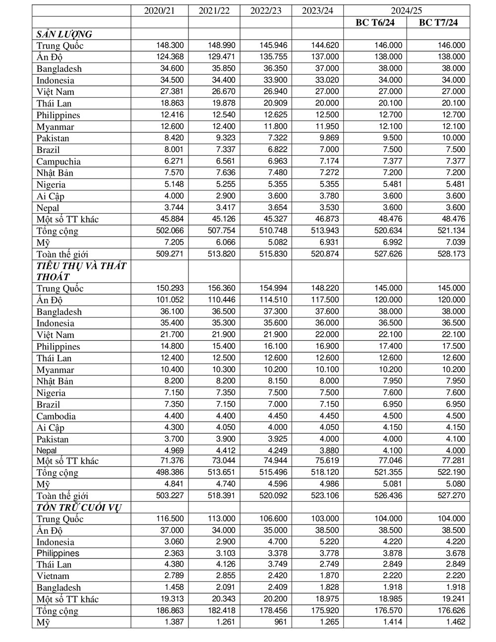 USDA dự báo sản lượng - tiêu thụ - tồn trữ gạo thế giới (báo cáo tháng 7/2024)
