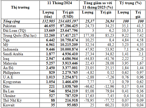 Sau đó là thị trường Nga, chiếm 6,8% trong tổng khối lượng và chiếm 7,6% trong tổng kim ngạch, đạt 1.181 tấn, tương đương 2,15 triệu USD, giá trung bình 1.818 USD/tấn, tăng 14,6% về lượng, tăng 32,6% về kim ngạch và giá tăng 15,8%.
