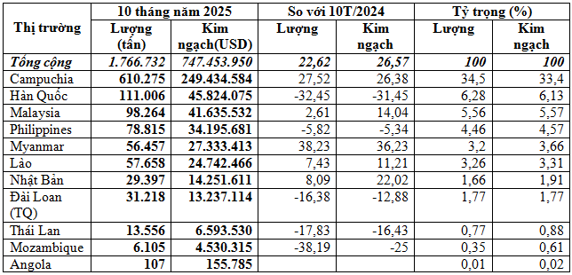 Phân bón của Việt Nam xuất khẩu nhiều nhất sang thị trường Campuchia, chiếm 34,5% về lượng và chiếm 33,4% về kim ngạch trong tổng xuất khẩu phân bón của cả nước, đạt 610.275 tấn, trị giá 249,43 triệu USD, giá trung bình 408,7 USD/tấn; tăng 27,5% về lượng, tăng 26,4% về trị giá nhưng giảm 0,9% về giá so với 10 tháng năm 2024.