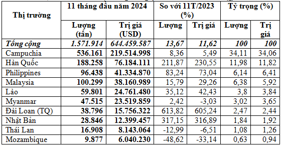 Phân bón của Việt Nam xuất khẩu chủ yếu sang thị trường Campuchia, riêng thị trường này đã chiếm trên 34% trong tổng khối lượng và tổng kim ngạch xuất khẩu phân bón của cả nước, đạt 536.161 tấn, tương đương 219,51 triệu USD, giá trung bình 409,4 USD/tấn, tăng 8,4% về lượng, tăng 5,5% kim ngạch nhưng giá giảm 2,7% so với cùng kỳ năm 2023. Riêng tháng 11/2024 xuất khẩu sang thị trường này đạt 57.609 tấn, tương đương 22,14 triệu USD, giá trung bình 384,3 USD/tấn, giảm 3,5% về lượng, giảm 4,5% kim ngạch và giá giảm 1,1% so với tháng 10/2024.