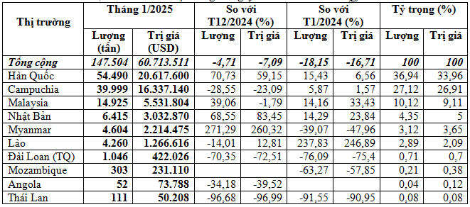 Xuất khẩu sang thị trường Malaysia đạt 14.925 tấn, tương đương 5,53 triệu USD, giá trung bình 370,6 USD/tấn, tăng 39% về lượng, nhưng giảm 1,8% kim ngạch và giá giảm 29,4% so với tháng 12/2024; so với tháng 1/2024 thì tăng cả lượng, kim ngạch và giá với mức tăng tương ứng 14,2%, 33,4% và 16,9%; chiếm 10,1% trong tổng khối lượng và chiếm 9,1% trong tổng kim ngạch.