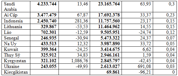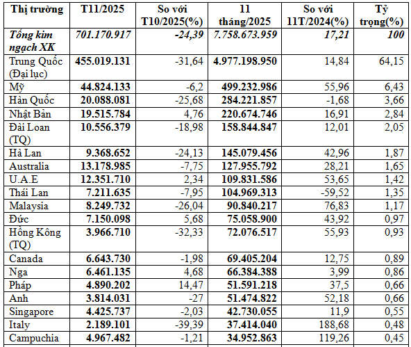 Đứng sau thị trường chủ đạo Trung Quốc là thị trường Mỹ đạt trên 499,23 triệu USD, tăng mạnh 56% so với 11 tháng năm 2024, chiếm 6,4%; Hàn Quốc đạt 284,22 triệu USD, giảm nhẹ 1,7%, chiếm 3,7%; Nhật Bản đạt 220,67 triệu USD, tăng 16,9%, chiếm 2,8%; Đài Loan đạt 158,84 triệu USD, tăng 12%, chiếm 2,1%...