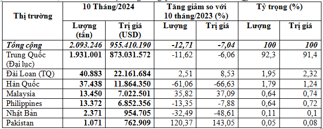 Riêng tháng 10/2024 ước đạt 176.383 tấn, tương đương 76,14 triệu USD, giá trung bình 431,7 USD/tấn, tăng 45,8% về lượng, tăng 34,2% kim ngạch nhưng giảm 7,9% về giá so với tháng 9/2024; còn so với tháng 10/2023 thì giảm 34,2% về lượng, giảm 44,1% kim ngạch và giảm 15,1% về giá.