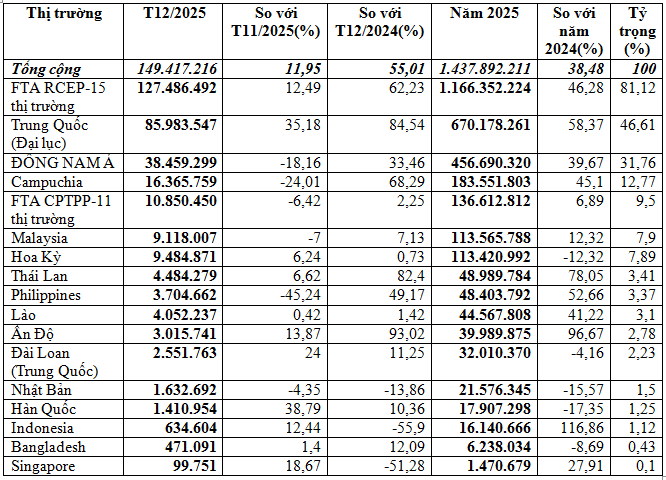 Xuất khẩu thức ăn gia súc sang thị trường Trung Quốc – thị ttường lớn nhất, tháng 12/2025 tăng 35,2% so với tháng 11/2025 và tăng 84,5% so với tháng 12/2024, đạt trên 85,98 triệu USD, tính chung kim ngạch xuất khẩu sang thị trường này năm 2025 đạt 670,18 triệu USD, tăng 58,4% so với năm 2024, chiếm 46,6% trong tổng kim ngạch xuất khẩu nhóm hàng này của cả nước.
